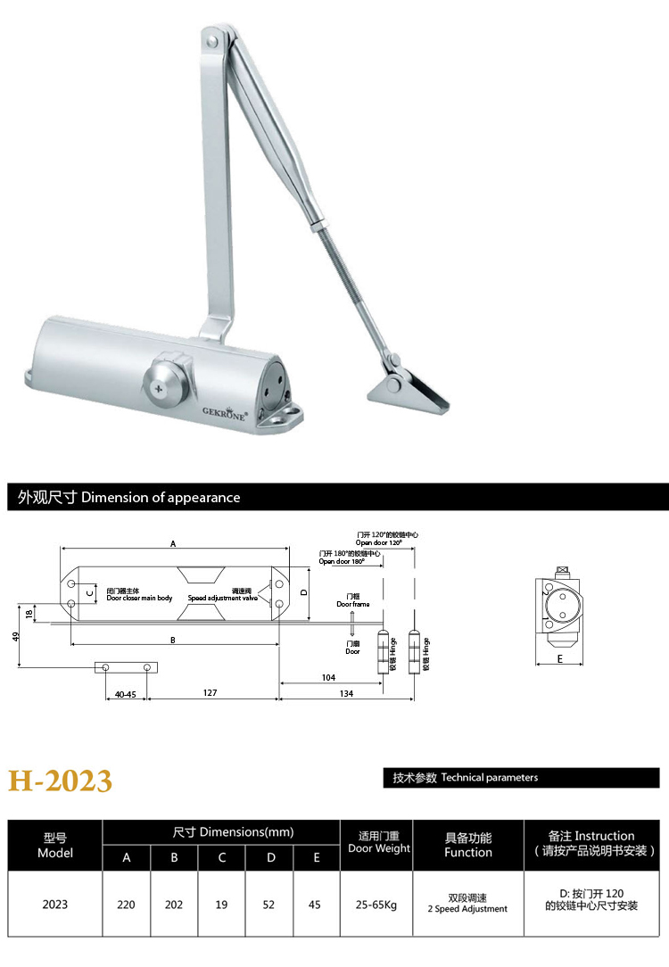 當(dāng)開門時,門體帶動連桿動作,并使傳動齒輪轉(zhuǎn)動,驅(qū)動齒條柱塞向右方移動。在柱塞右移的過程中彈簧受到壓縮,右腔中的液壓油也受壓。柱塞左側(cè)的單向閥球體在油壓的作用下開啟,右腔內(nèi)的液壓油經(jīng)單向閥流到左腔中。當(dāng)開門過程完成后,由于彈簧在開啟過程中受到壓縮,所積蓄的彈性勢能被釋放,將柱塞往左側(cè)推,帶動傳動齒輪和閉門器連桿轉(zhuǎn)動,使門關(guān)閉。在彈簧釋放過程中,由于閉門器左腔的液壓油受到壓縮,單向閥被關(guān)閉,液壓油只能通過兩條裝有節(jié)流閥芯的流道回流到右腔。因此液壓油對彈簧釋放構(gòu)成了阻力,即通過節(jié)流達到了緩沖的效果,使門關(guān)閉的速度得到了控制。閥體上的節(jié)流閥可以調(diào)節(jié),可控制不同行程段的、可變化的閉門速度。盡管不同廠家生產(chǎn)的閉門器結(jié)構(gòu)、尺寸有差異,但原理是相同的。