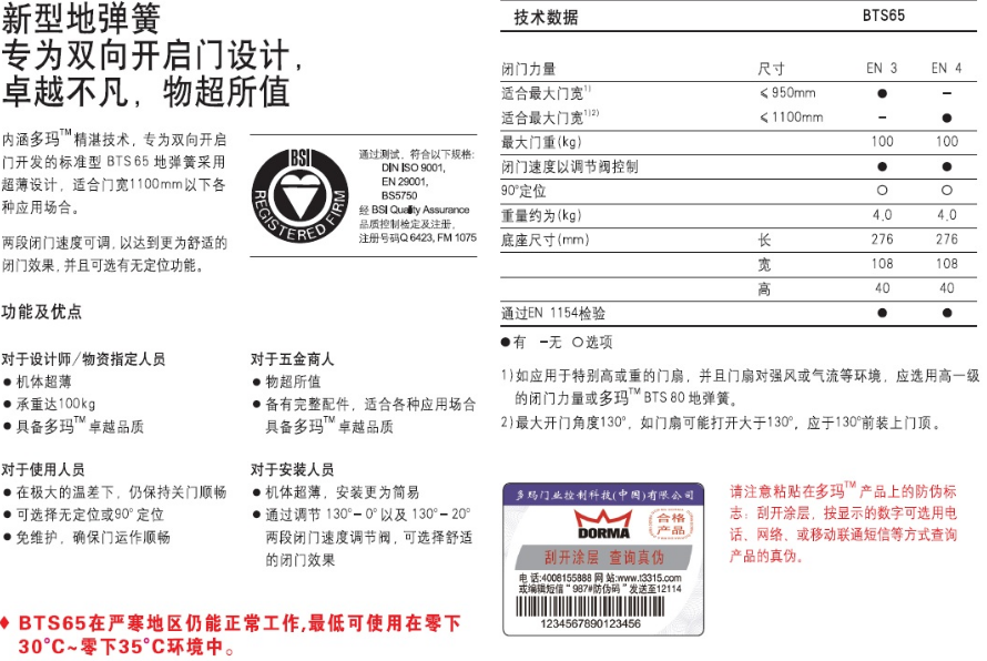 dorma 多瑪BTS65地彈簧,鄭州多瑪BTS65地彈簧代理商,鄭州多瑪?shù)貜椈纱砩?,多瑪BTS65地彈簧價(jià)格,多瑪?shù)貜椈?/strong>100公斤地簧 適用于100公斤以下門重,1100毫米以下門寬,兩段閉門速度可調(diào)(130度角-0度角;130度角-20度角) 機(jī)體超薄設(shè)計(jì),僅40mm厚,蓋板尺寸290*130mm,90゜可定位可選.多瑪?shù)貜椈稍敿?xì)參數(shù),多瑪?shù)貜椈蓛r(jià)格,請咨詢 13271597000